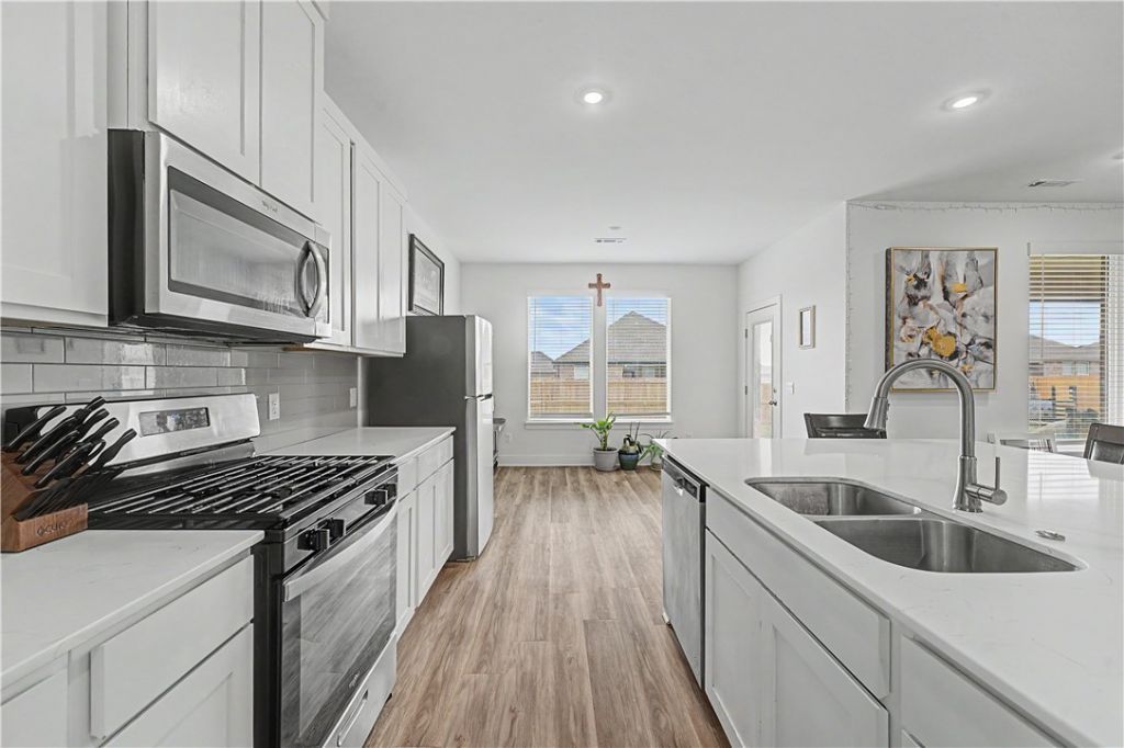 Welcome to 2008 Hahn St, offering 4 bd, 2 bath, 2163 sqft with a layout built for how people live today. Open-concept design centers around a large island kitchen with 42 cabinets, quartz counters, tile backsplash, & stainless appliances. LVP flooring through main areas, LED lighting, & a modern electric fireplace anchor the space. Primary suite features dual quartz vanities, oversized tiled walk-in shower, & separation from secondary bedrooms. Home include tankless water heater, gas heat, insulated garage, privacy-fenced backyard, & Wi-Fi controlled thermostat, Smart home?ready with ability to add video doorbell, garage controls, lighting automation, & more via app. Located minutes to Pea Ridge schools with quick access to Bentonville & Walmart campus?ideal for buyers wanting space at better pricing without sacrificing commute.